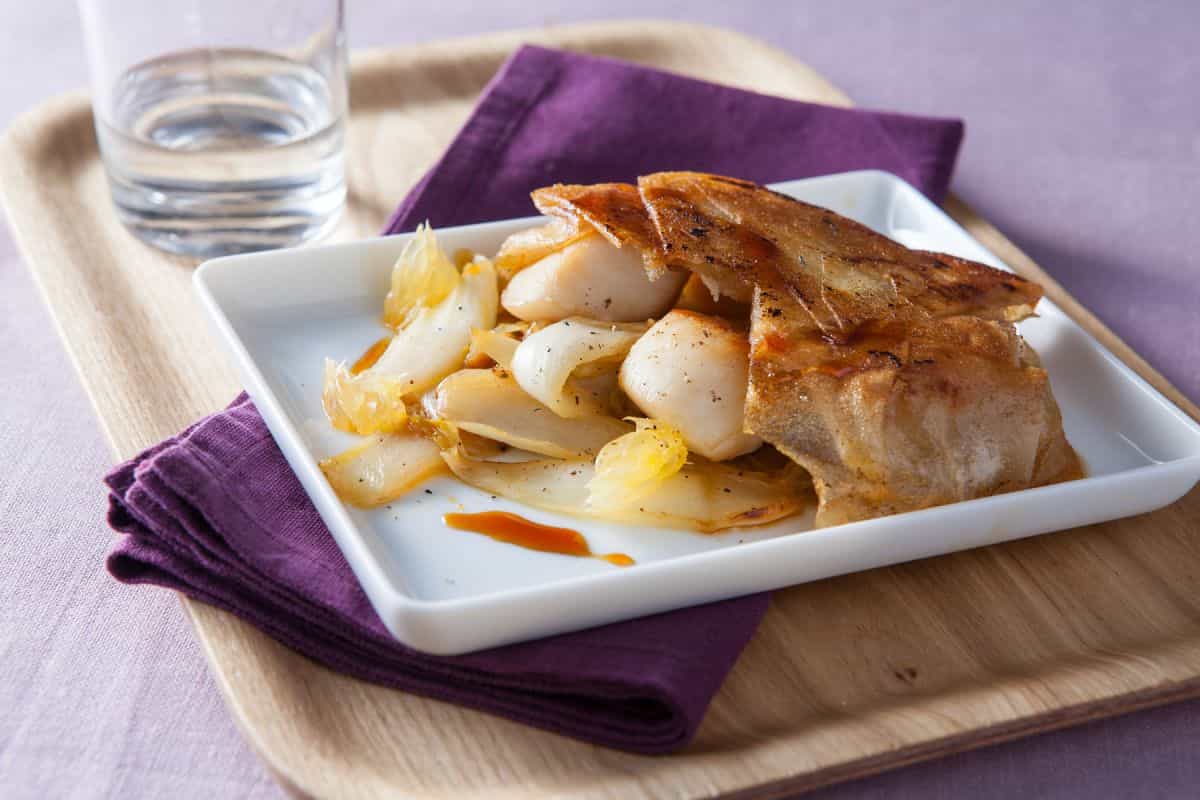 Croustillant d'endives caramélisées à l'orange et aux noix de Saint-Jacques